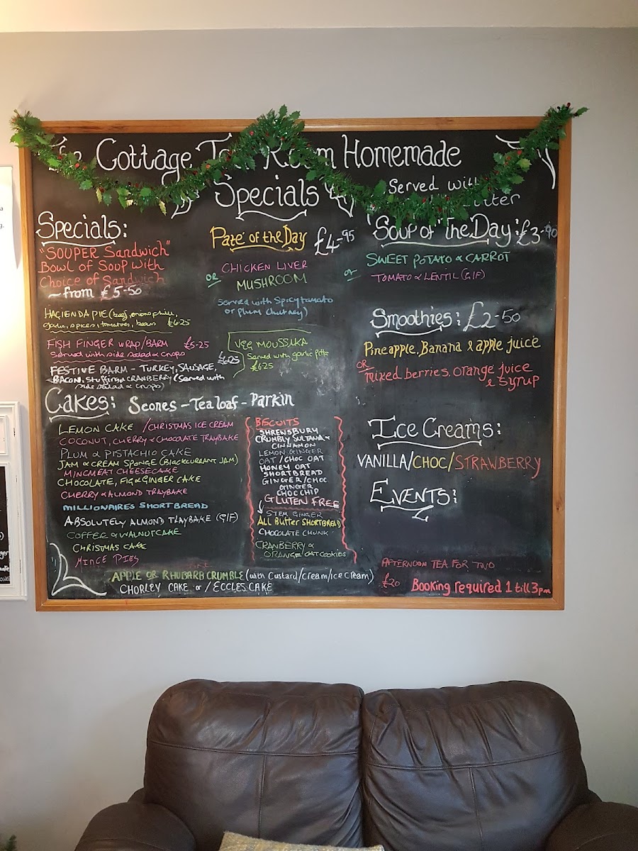 Wrapping up, the menu at The Cottage Tea Room (25a School Ln, Brinscall) feels like a comforting, all-day celebration of classic British café fare-simple, hearty, and clearly built for people who want reliable favourites done properly. If you’re after something filling, the All Day Breakfast options like Full English and Small Breakfast set the tone, while the Barmcakes, Bread Or Toast section keeps it traditional with choices such as Big Breakfast, Bacon, Sausage, Bacon And Sausage, and Bacon And Egg. For lighter bites (or a quick pick-me-up), you’ve got toast-based staples including One Egg/One Slice, Two Eggs/Two Slices, One Slice Of Cheese On Toast, Two Slices Of Cheese On Toast, and One Slice Of Beans On Toast-straightforward, no-fuss comfort. Drinks match the tea-room vibe perfectly, from Tea For One / Decaf and Tea For Two / Decaf to Various Speciality Teas, plus homely extras like Glass Of Milk and Hot Bovril; and if you prefer something cold, there’s Fresh Orange Juice, Bottled Water, and Vimto Remix Cordial. For lunch-style choices, the sandwich list covers the classics-Tuna Mayonnaise, Egg Mayonnaise, Cheese, Ham, and Beef-while Jacket Potatoes offer satisfying options like Butter, Beans, Cheese, Cheese And Beans, and Tuna Mayonnaise. The hot selection adds a bit more indulgence with choices like Beef And Onion Panini With Horseradish Sauce Or Mustard, Cheddar And Mozzarella Cheese Panini With Sun-Dried Tomatoes, Tuna Mayo Panini With Black Olives, Bacon Stilton And Tomato On Toasted Bread, and Smoked Salmon And Cream Cheese On Toasted Bagel. And for anyone saving room for something sweet, the cake counter sounds tempting-Tea Loaf Or Parkin And Butter, Chorley/Eccles Cakes, Cookies, plus treats like Special Treat Sundae, Lemon Cake, Mincmeat Cheesecake, Cherry & Almond Traybake, and Millionaires Short Bread, with a gluten-free nod via Chocolate Chunk. Overall, it’s a well-rounded, comfort-first menu that suits breakfast lovers, sandwich-and-tea regulars, and dessert hunters alike.